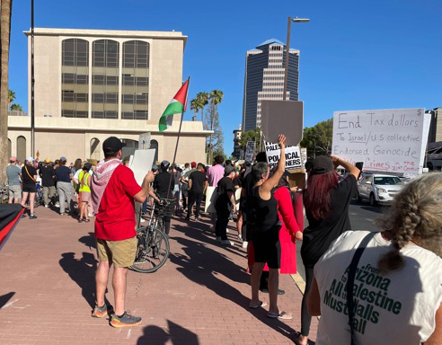 Tucson Peace Center Board members joined (l-r) a Nuclear Resister and WILPF antinuclear protest at U of A in 2022 (photo by Deb Livingston of Tucson WILPF), were at the Tucson Peace Center table at the Iskashitaa Spring Fair and Plant Sale in 2025 (photo by Betts Putnam-Hidalgo), and were at the Community Rally for Palestine in 2023 (photo by Mary De Camp; see more photos HERE).