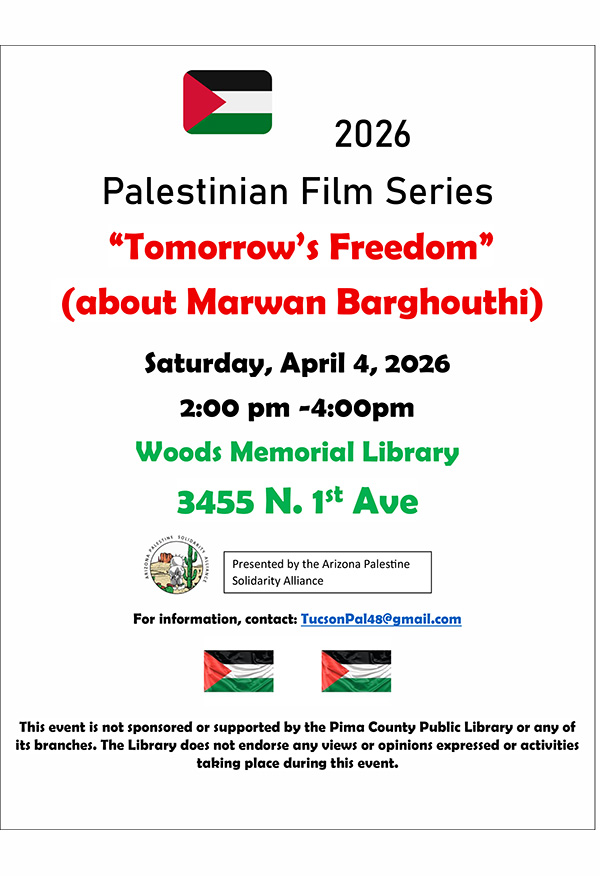 CORRECTION TO LISTING IN APRIL PRINT CALENDAR: Arizona Palestine Solidarity Alliance Will Show Tomorrow’s Freedom on Saturday, April 4, from 2:00-4:00 p.m. Read More…