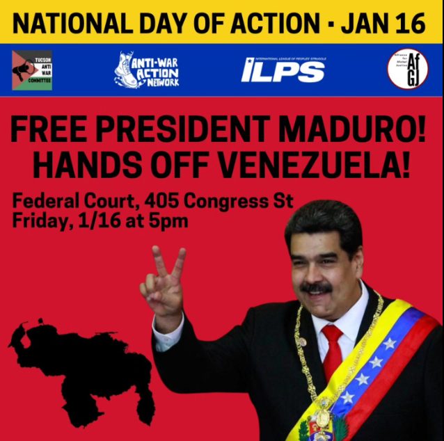 Tucson Anti-War Committee is joining the call for a national day of action this Friday, January 16th to demand Free President Maduro! Hands Off Venezuela!