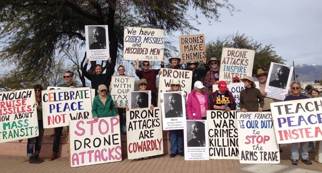 Air National Guard troops at Davis-Monthan AFB place Tucson squarely on the global battleground, by remotely piloting UAV’s (Unmanned Aerial Vehicles) that are firing guided bombs and missiles and killing more civilians than targeted “terrorists” in unnamed sovereign nations. Ground the Drones!