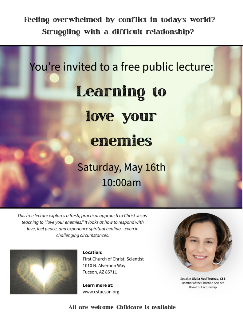 This public lecture explores the topic, “Learning to love your enemies,” asking, What if it were actually possible to respond to conflict, hurt, or opposition with genuine love—and find peace in the process? Many of us are searching for a better way to handle difficult relationships and contribute meaningfully toward a peaceful society. This free lecture explores a practical, spiritual approach to loving your enemies, rooted in the teachings of Christ Jesus—not as an abstract ideal, but as something that can bring real healing and transformation to everyday life. This talk is open to everyone—whether you’re familiar with Christian Science or simply curious to explore a more peaceful and compassionate way of living and loving. The speaker is Giulia Nesi Tetreau, of the Christian Science Board of Lectureship.
