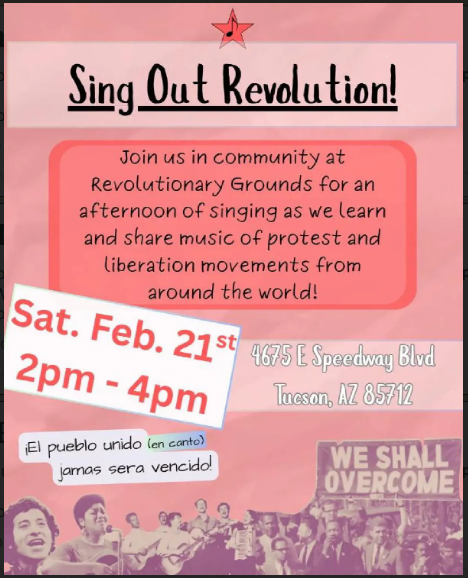 From the organizer: Revolutionary Grounds Bookstore and Coffee will be hosting an afternoon of revolutionary singing. No moment of resistance, no fight for democracy, has ever been complete without music, and we wish to celebrate and enjoy that music together in community. There will be fan-favorites, but my hope is that everyone also leaves learning at least one new song of protest.