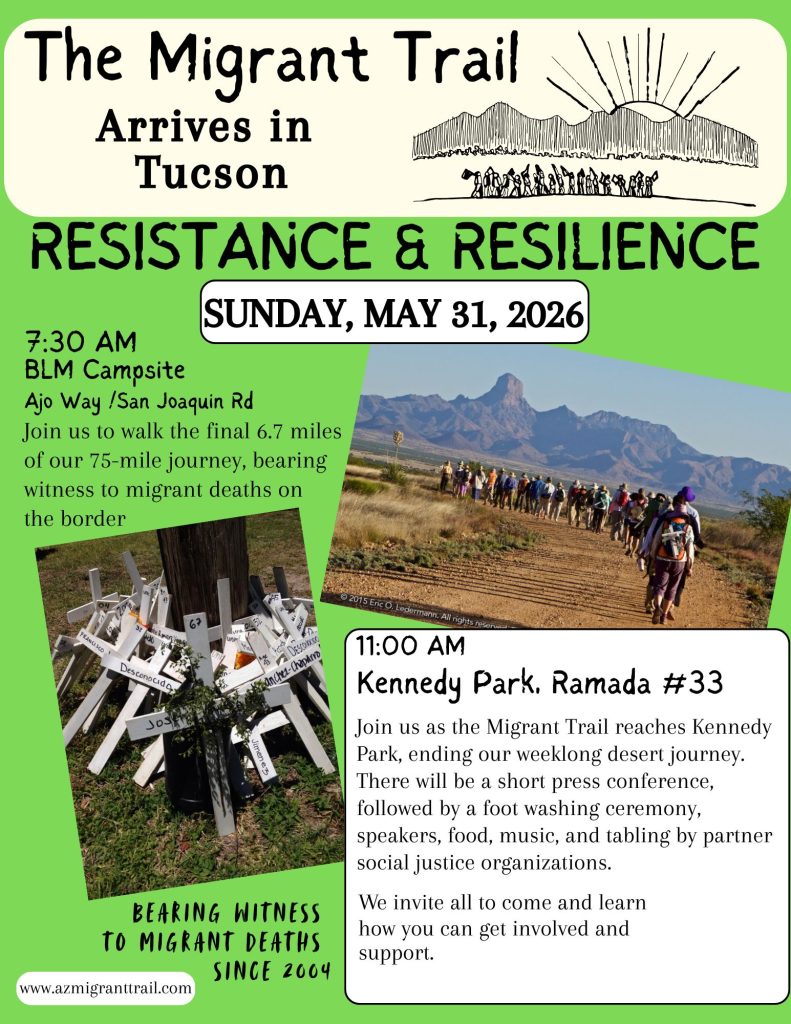 Join us as the Migrant Trail reaches Kennedy Park, ending our weeklong desert journey. There will be a short press conference, followed by a foot washing ceremony, speakers, food, music, and tabling by partner social justice organizations.