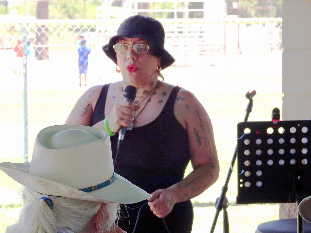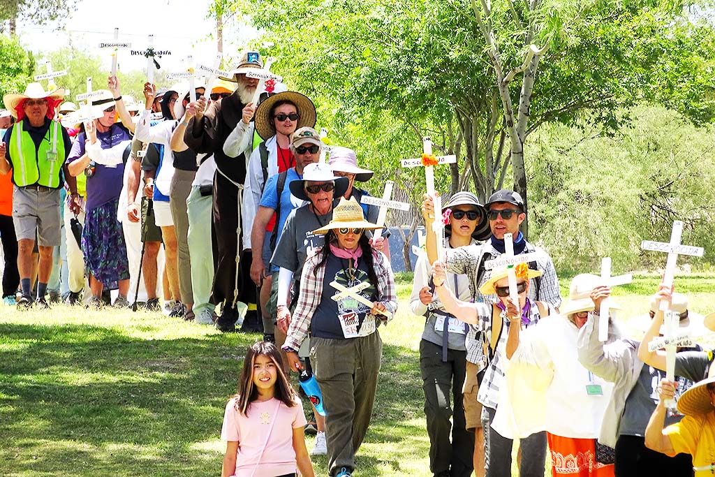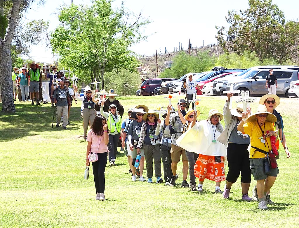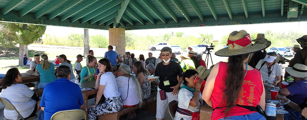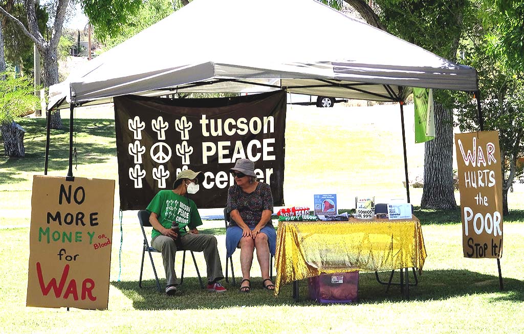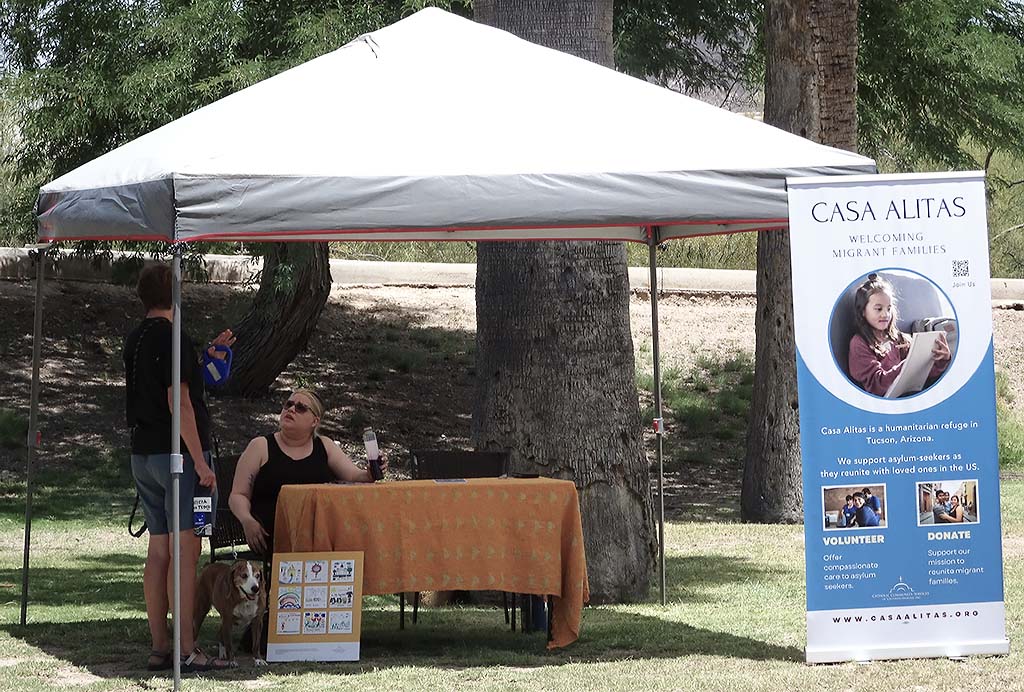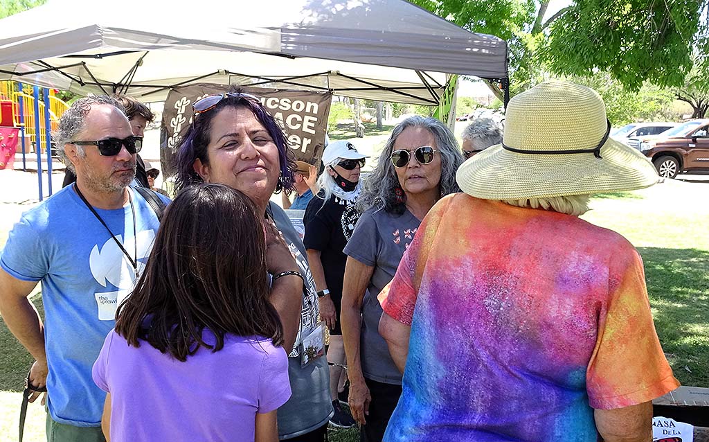 Migrant Trail 2023 arrived in Tucson at 11:00 AM on Sunday, June 4. There was a short press conference at Kennedy Park, followed by speakers, food, music, and tabling by border justice organizations. The Tucson Peace Center was one of those organizations, and Board Vice President Vana Lewis spoke on behalf of the Peace Center. Here are some photos of that event, taken by Board Treasurer Richard Fridena.