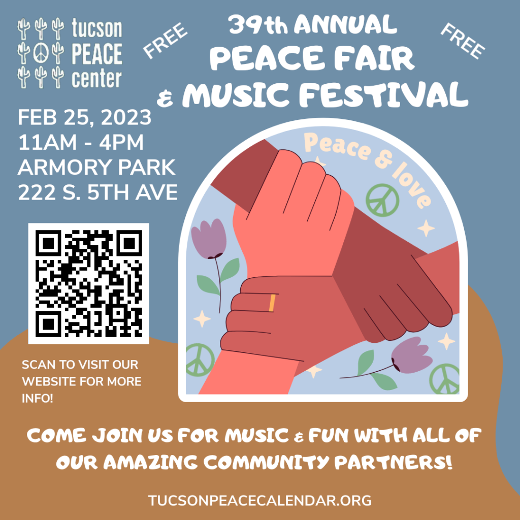 The 2026 Peace Fair & Music Festival took place on Saturday, February 28, 2026, from 11:00 a.m. to 4:00 p.m. in Reid Park. We got some great publicity from this article by Andres Valenzuela at the Arizona Sonoran News: “Peace Fair returns with renewed urgency, energy” and from this article by the Three Sonorans: “42 Years of Showing Up: Tucson’s Peace Fair Returns This Weekend.” Here’s a list of 2026 Peace Center member groups. See the Member Groups page for pictures of some of the groups who tabled at the Peace Fair. And here’s a list of the performers who played at the Fair: